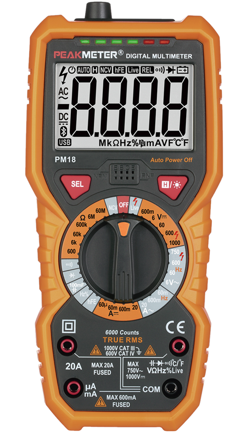 PeakMeter PM18 – это портативный многофункциональный цифровой мультиметр с функцией измерения среднеквадратического значения True RMS, оснащенный большим ЖК-дисплеем с задней подсветкой для удобства считывания показания, и фонарем. PeakMeter PM18 имеет функцию защиты от перегрузки и индикацию разряженной батареи.