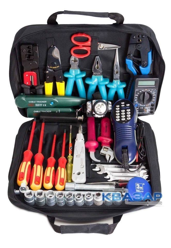 Набор состоит из 32 предметов, в которые входят: губцевый инструмент, изолированный до 1000В, торцевые головки, тестовая трубка, инструмент для заделки витой пары в кросс-панель, ключи, пресс-клещи, мультиметр.