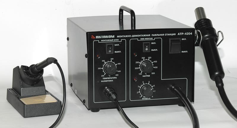 Паяльная станция АТР-4204: Монтажный канал и термофен с возможностью монтажа-демонтажа SMD-элементов. Монтаж t=200...480 °C, производительность термофена 15 л/мин., антистатическая защита, керамический нагреватель.
